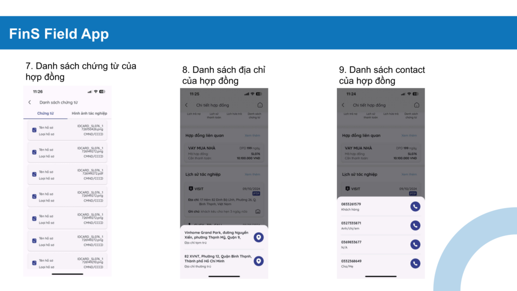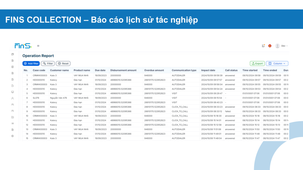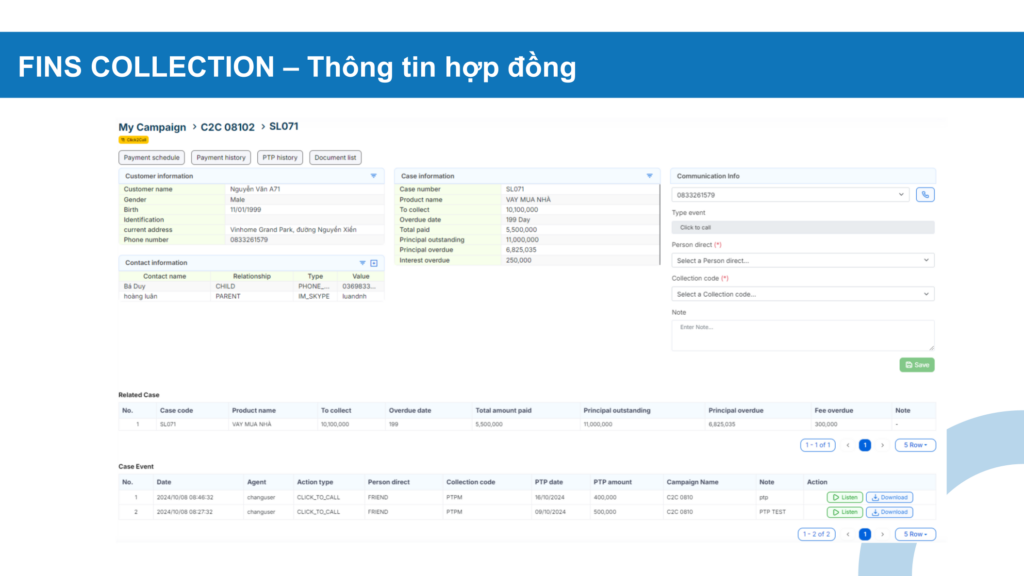 – Agents cũng sẽ theo dõi các hợp đồng và chiến dịch được phân công, với phần mềm tự động phân bổ công việc cho cán bộ thu hồi nợ phù hợp với tỷ lệ đã xác định. Thông tin về khách hàng, quá trình thu hồi nợ và các khoản vay sẽ được trình bày chi tiết trong từng trường hợp cụ thể cần thu hồi