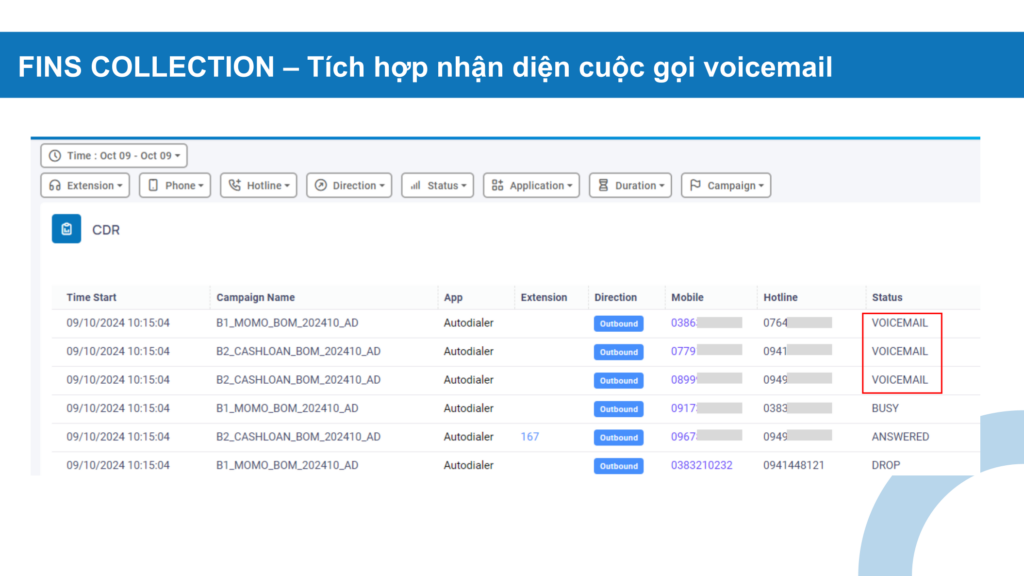 – Tích hợp nhận diện cuộc gọi Voicemail, bỏ qua các cuộc gọi đi vào voicebot, tránh lãng phí thời gian