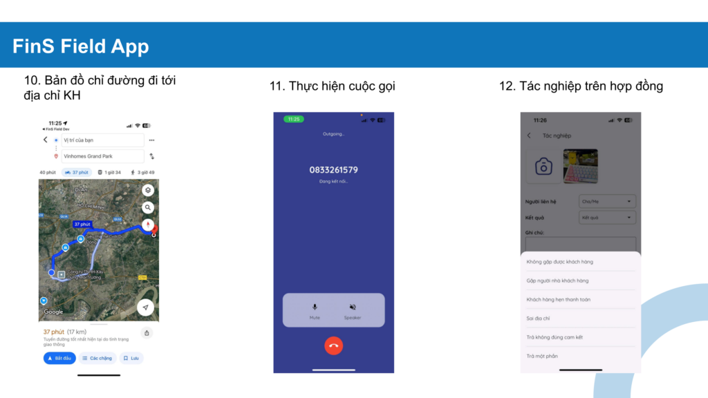 – Ứng dụng Field chuyên dụng dành cho nhân viên: Theo dõi các chiến dịch đã được phân công, lập kế hoạch cho các cuộc gặp hôm nay, kiểm tra những trường hợp đã được lên kế hoạch, xem chi tiết hợp đồng, danh sách tài liệu liên quan của hợp đồng và danh bạ liên hệ tương ứng.