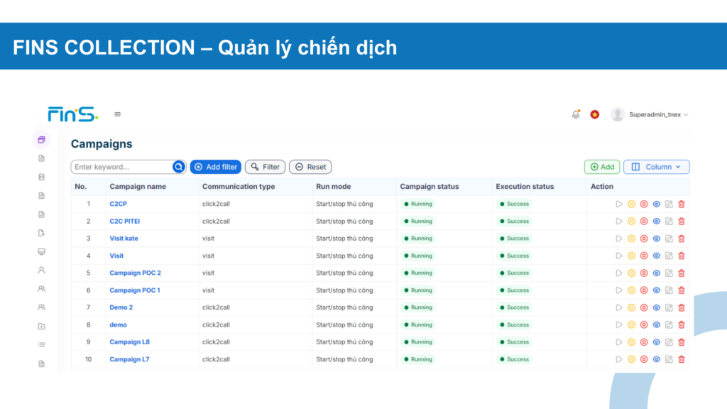 – Quản lý các chiến dịch và thực hiện cài đặt chiến dịch: Auto Call / Outbound Dialer giúp gọi hàng nghìn cuộc gọi cùng một lúc, tối ưu hóa tỷ lệ kết nối và dự đoán thời điểm gọi thích hợp. Gửi SMS, email, Zalo, Viber, đồng bộ thông tin theo từng chiến dịch