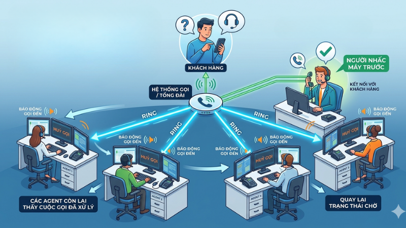 | Định tuyến cuộc gọi (Call Routing) | Quy trình tổng thể phân phối cuộc gọi đến đúng đích | Chuyển hướng cuộc gọi dựa trên nhiều quy tắc phức tạp | Khách gọi hotline → Hệ thống phân tích → Chuyển đến bộ phận bán hàng miền Bắc |