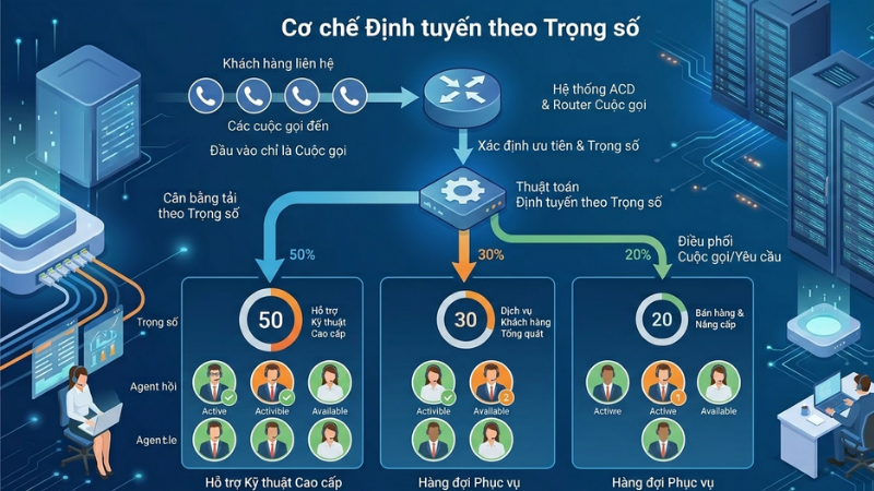 Cơ chế hoạt động của định tuyến theo trọng số như sau: Người quản lý thiết lập tỷ lệ phân phối cho mỗi nhân viên. Ví dụ, trong team 4 người, nhân viên nhiều kinh nghiệm nhận 40% tổng cuộc gọi, nhân viên có kỹ năng trung bình nhận 35%, nhân viên mới nhận 25%. Hệ thống ACD sẽ tự động điều chỉnh việc phân phối để đảm bảo tỷ lệ này được duy trì trong một ca làm việc hoặc một ngày.