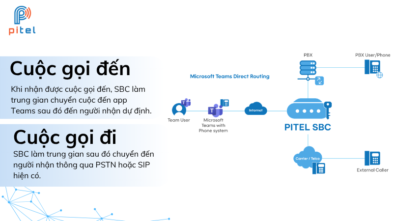 Cách thức hoạt động của SBC: Khi nhận được cuộc gọi đến từ bên ngoài, luồng xử lý diễn ra như sau: cuộc gọi từ PSTN đến SIP Trunk của nhà cung cấp, SBC nhận tín hiệu và thực hiện xác thực/kiểm tra bảo mật, SBC chuyển đổi định dạng SIP và codec nếu cần, cuộc gọi được định tuyến vào Microsoft Teams, Teams hiển thị cuộc gọi đến cho người dùng đích, người dùng nhấn nút “Accept” trên ứng dụng Teams để trả lời. Khi thực hiện cuộc gọi đi, luồng xử lý ngược lại: người dùng gọi từ Teams, Teams Phone System định tuyến đến SBC, SBC kiểm tra quyền gọi và chọn route phù hợp, SBC kết nối với SIP Trunk, cuộc gọi được thực hiện ra ngoài qua PSTN.